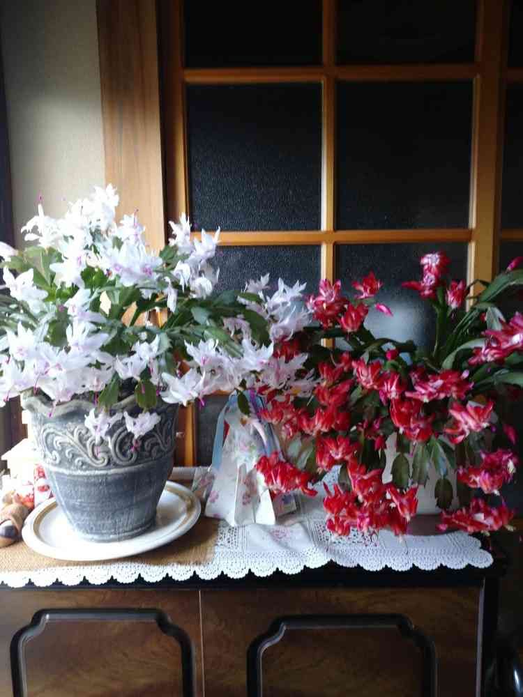 玄関のシャコバサボテンまだ咲いています。部屋で咲かせて