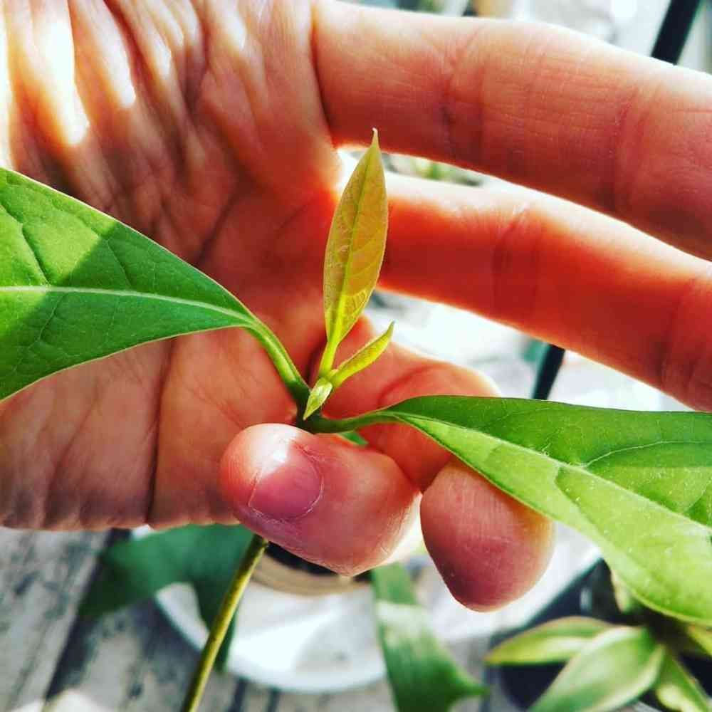 アボカド実生の苗を日と風に当ててます。室内だと新芽が展開するんだなぁ