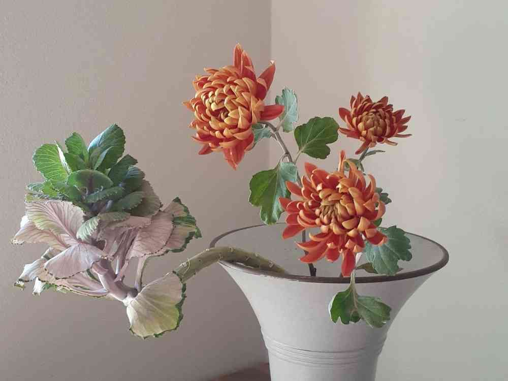菊だけではさみしいので、庭で伸び放題の葉牡丹も一緒に入れました。