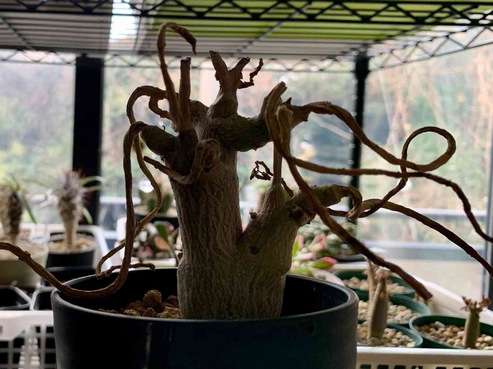 完全に落葉したプテロディスクス・マカチニエンシス。一年で伸びた茎(枝⁇)はそのままなのかな?そうだとすると、そのうちメドゥーサの頭みたいになるね😁