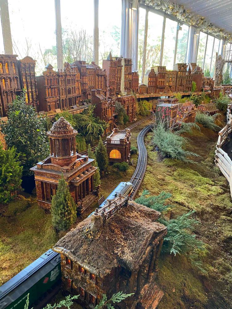 NYブロンクス植物公園のミニチュア・トレイン・ショー。可愛い電車がクルクル走り回る中、私は建造物に釘付け。何とこれ、木枝や木の実、葉っぱ、樹脂などを駆使して一つ一つ大事に作られているんです。職人魂と植物への愛情が伝わってくる素晴らしい展示でした。