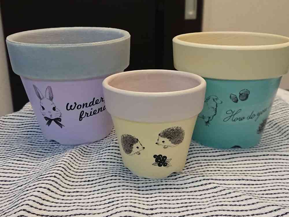今まで100均の鉢に植えることが多かったのですが、素焼き鉢にペイントとデコパージュしてみました(*´-`)