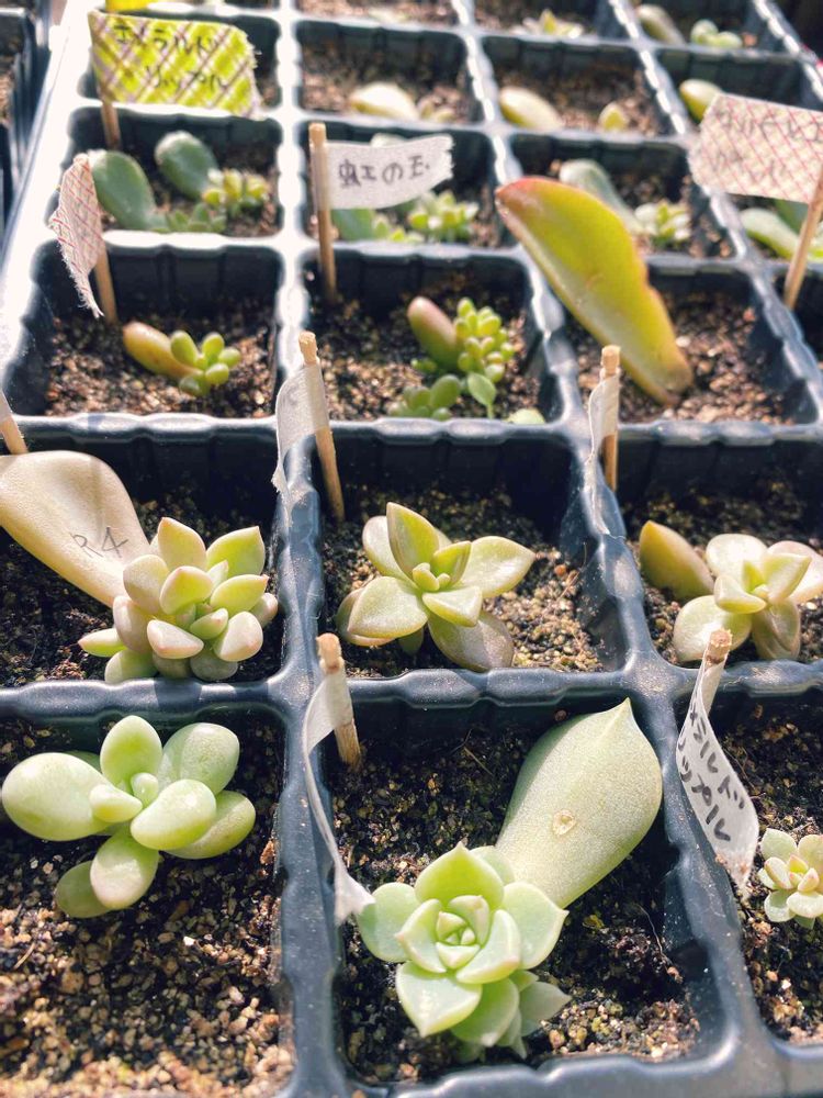 葉挿しで買った、パクさん苗のピンクローズさん(左側の手前から2番め)が、ちょっとよくわからない形になってる…大きくなったら、ちゃんとロゼット状になるのかな?かわいいからいいんだけどね(๑°艸°๑)♡