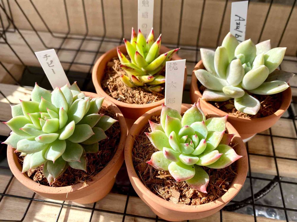 名前に惚れたAzulBlueと前から欲しかった桃太郎&魅惑の宵、見た目が好きで思わず手に取ったティッピー。鶴仙園さんのミニ多肉コーナーからお迎えしたちびっ子どれも可愛い。今からでも紅葉するかなあ?