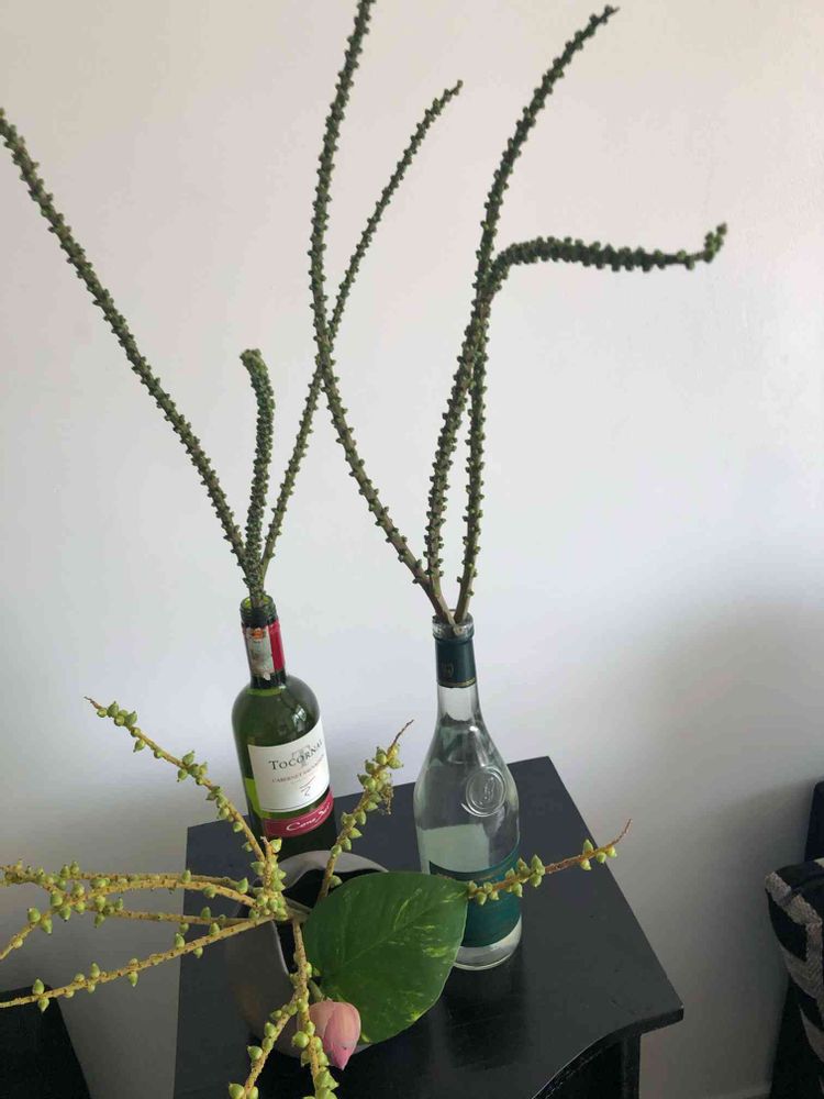 ヤシの実をもらって解体して瓶に飾りました。動きが面白い。珍しいので生けてみたかったです。