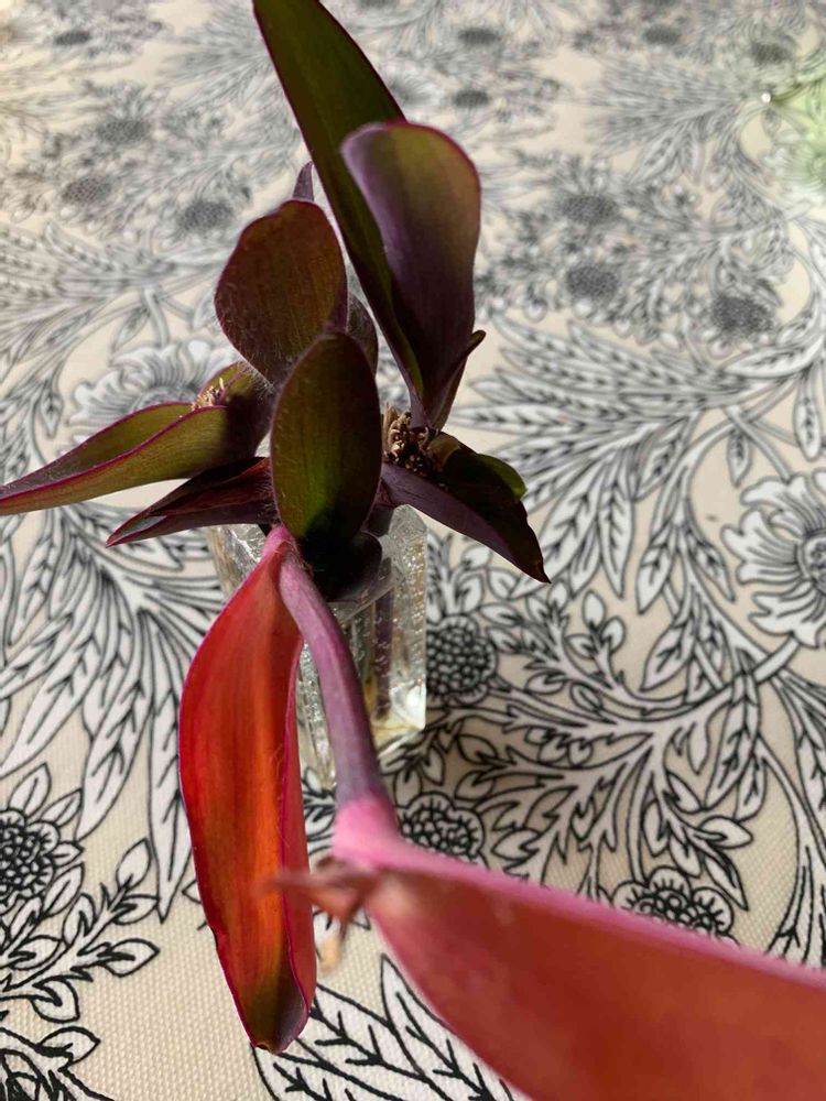 お部屋の中の、「ムラサキゴテン」ですが、葉っぱの色が紫から赤に変わっています😅