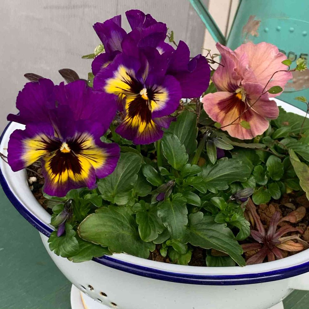 お友達にいただいたフリフリパンジーは、お気に入りのコランダーに🤗