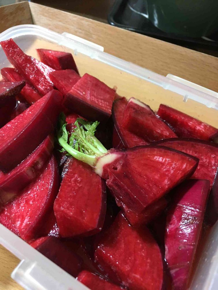 酢とてんさい糖で漬けてみたので余計に赤くなりました