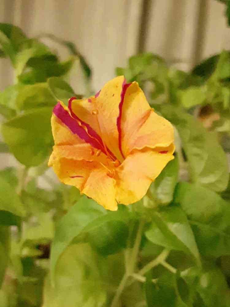 オシロイバナ咲きました。今日は17時過ぎから咲き始めました。もう少し花開くかもしれませんが久しぶりに咲いたので思わず撮ってしまいました。初期の頃の花の様に黄色地に赤い線の様な柄が入ってます。