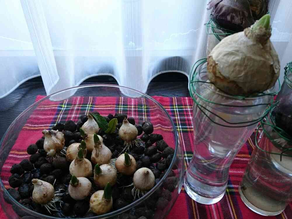 私はハイドロボールの上に球根を乗せて育てていますが…花屋さんで小さなガラス容器に栽培されているのを見かけました。