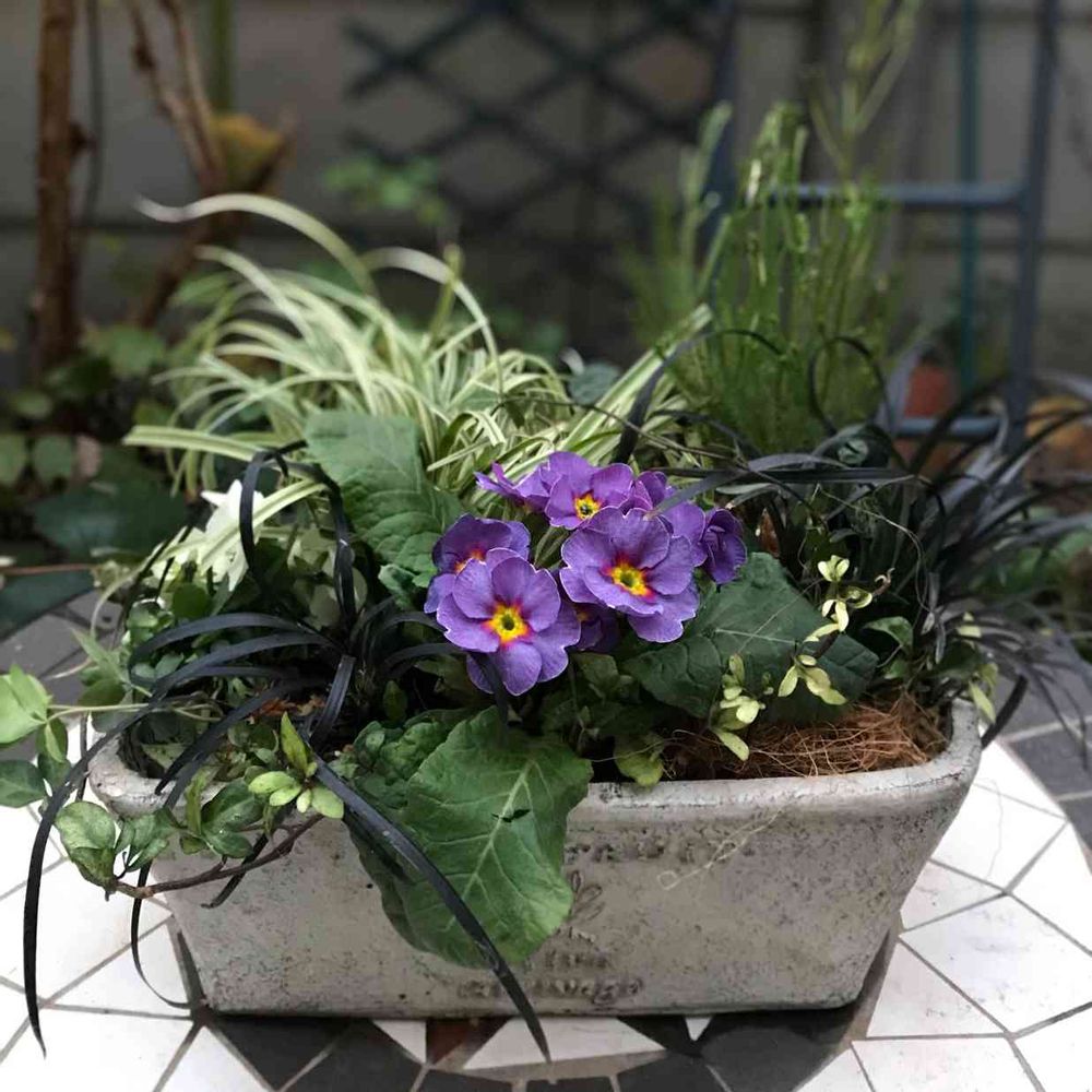 夏にペチュニアを植えていた寄植えリメイク。カレックスが倍に増えていたので株分けし、ビオラとバーゼリアを追加した。