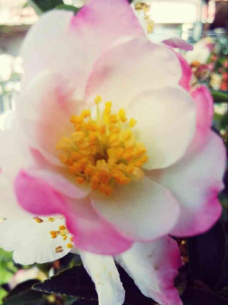 可愛い色のサザンカ、初めて見ました。少しピンクが入って、綺麗ですね。💞