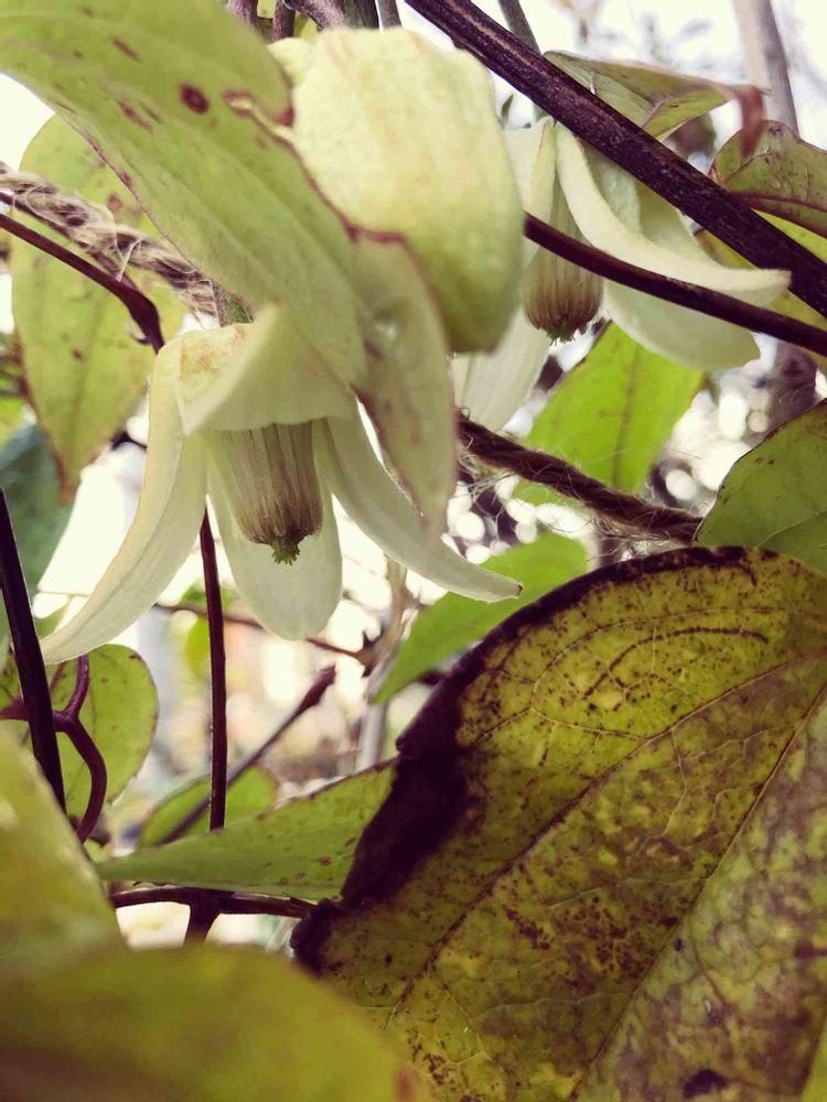 クレマチス アンスンエンシス開花してます。雨焼けが酷い。冬に花があるのは嬉しいけど土地柄毎年雪焼けか雨焼けで汚い開花となり残念。