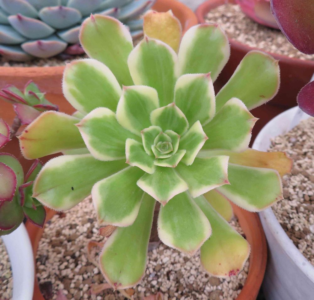 アエオニウムたちが元気な季節になった。艶日傘も、淡い緑に白い縁取りの葉が重なる中心部の色合いがきれいになってきた。春にかけて大きく成長してほしい。