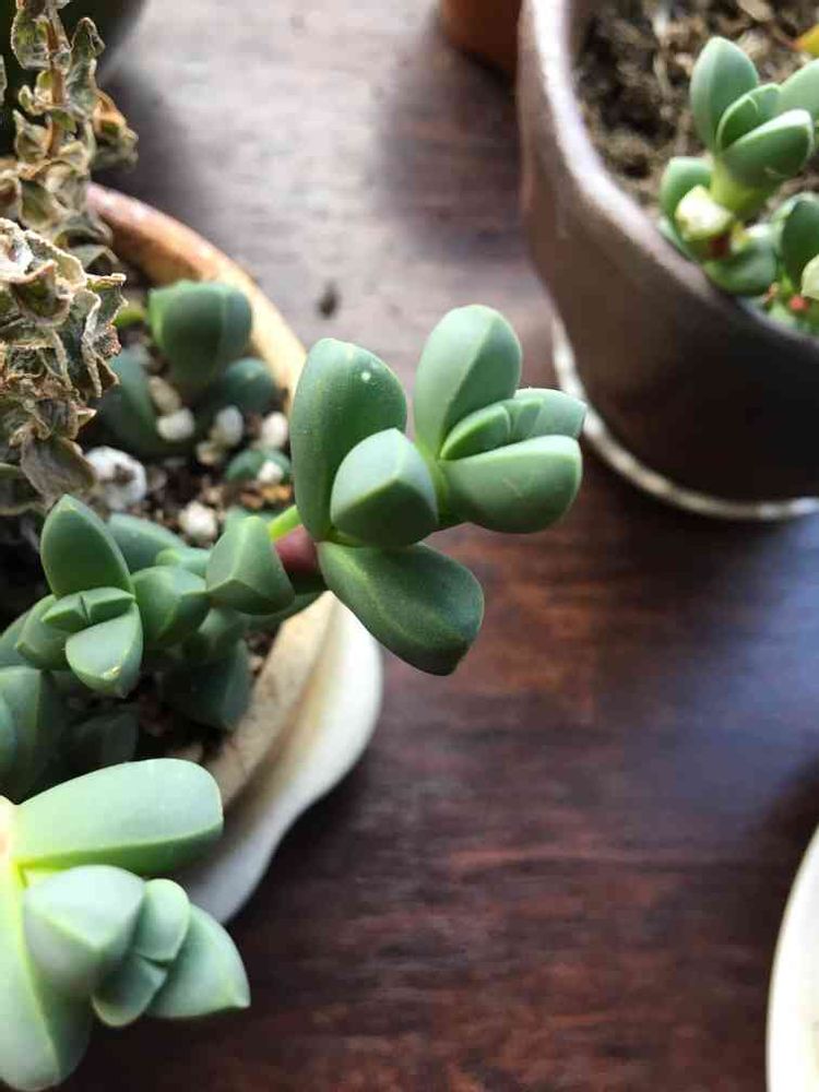 UME555さんの仰るとおり、レーマニーが最も近い見た目だと思います。和名は夕波(麗人玉)です。碧魚蓮と似ているため、よく勘違いされます。ただ碧魚蓮はエキノス属なのに対してレーマニーはデロスペルマ属なので全くの別物です。オークションとかでも、碧魚蓮と勘違いして出品するかたがいらっしゃいますね。決定的な違いは、成長方法です。碧魚蓮は自生地だと、岩肌を這うように伸びていくので、垂れ下がります。一方レーマニーは、画像のように上へと伸びていきます。また碧魚蓮は涼しい季節が活発で、レーマニーは暖かい季節のほうが活発です。
