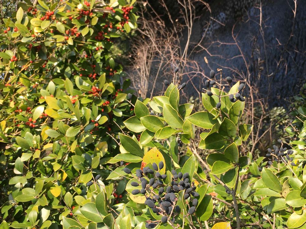 赤い実はマサキ、黒い実はネズミモチですね。😀