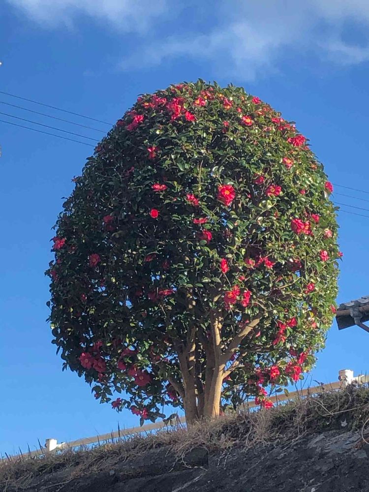 ネタ切れで、余計なものが写り過ぎなpicですがアップさせてもらいます🙇♂️街路樹のツバキが玉造りに剪定されて青空にGSバエていたので📸してきました!