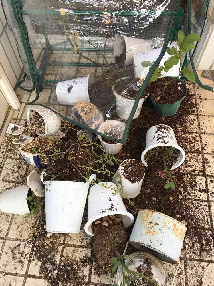 挿し木の子、大事な子たちを入れてあったの。😭薔薇の挿し木子、土を掴んでないから、すっぽり放りだされていました。