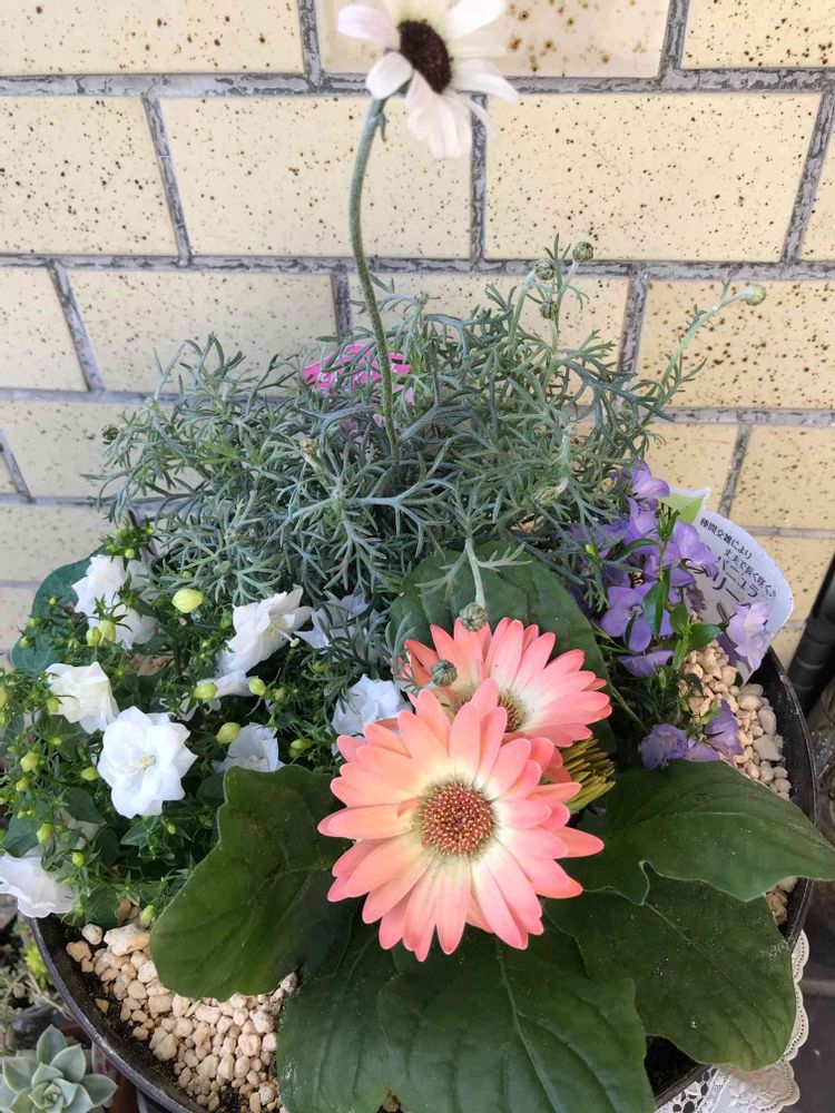 大急ぎでお花買ってすぐ植えつけて届けたから、ガーベラの葉が場所とってるね😅