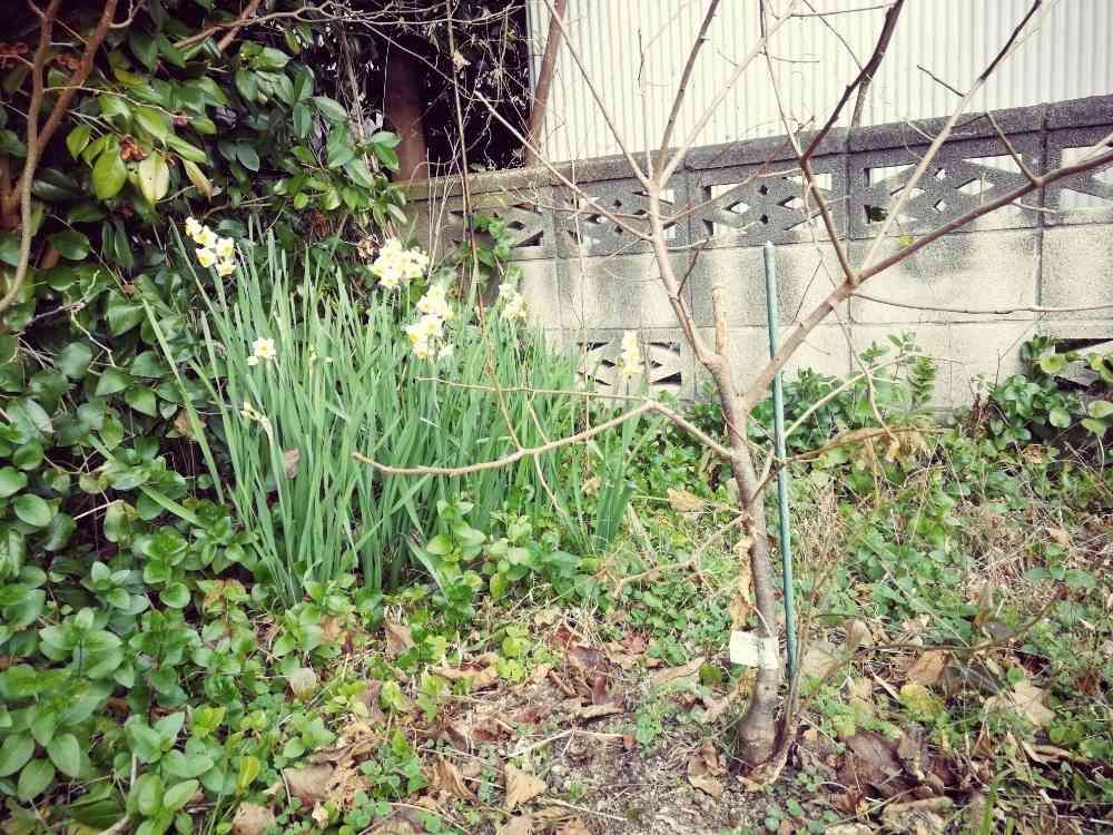 植え付けてから3年経っても全く変わらず成長しない柿の木と、その後ろで毎年変わらず咲く水仙。