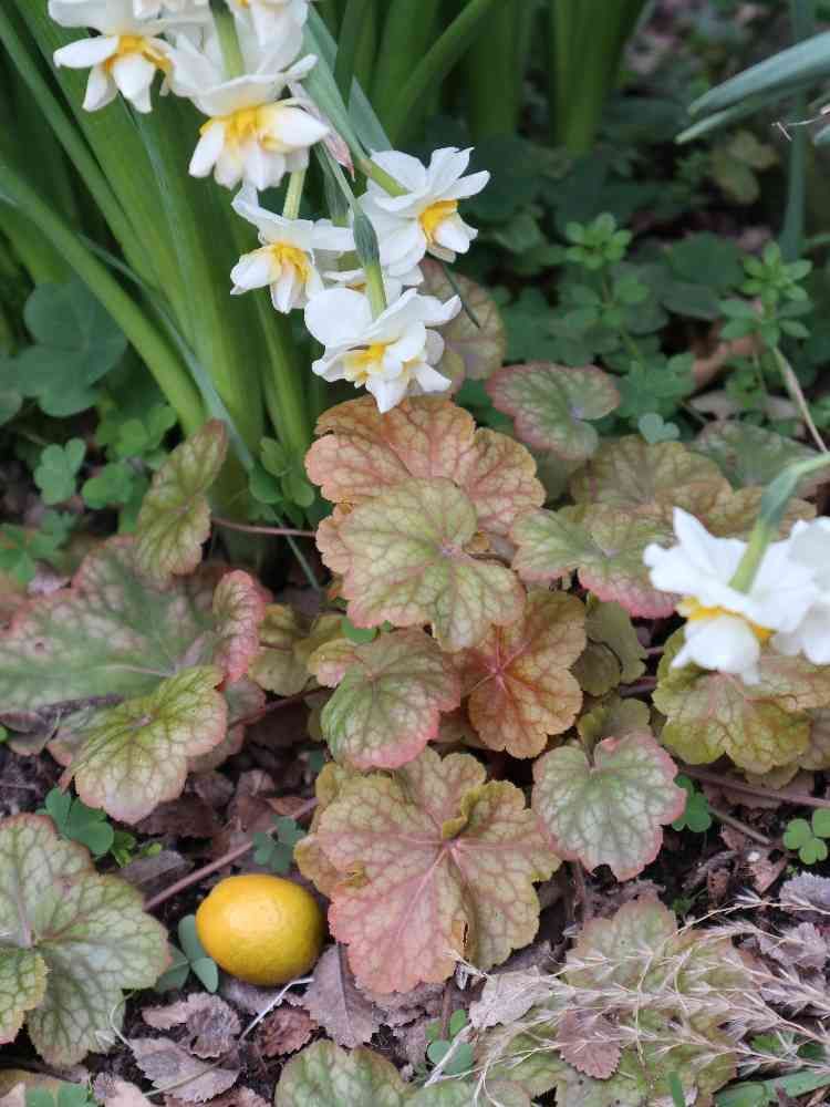 水仙だらけの庭で今頃になって、ススキの刈り取りをしました。ふと横を見ると、ヒューケラの株元からも水仙が(;)ゞ