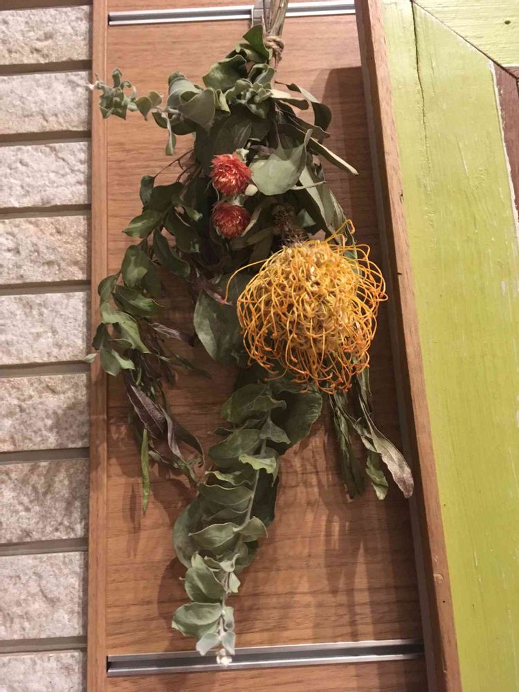 庭のドドナエア とユーカリポポラス、パールアカシアを使って、初めてのスワッグ作ってみた