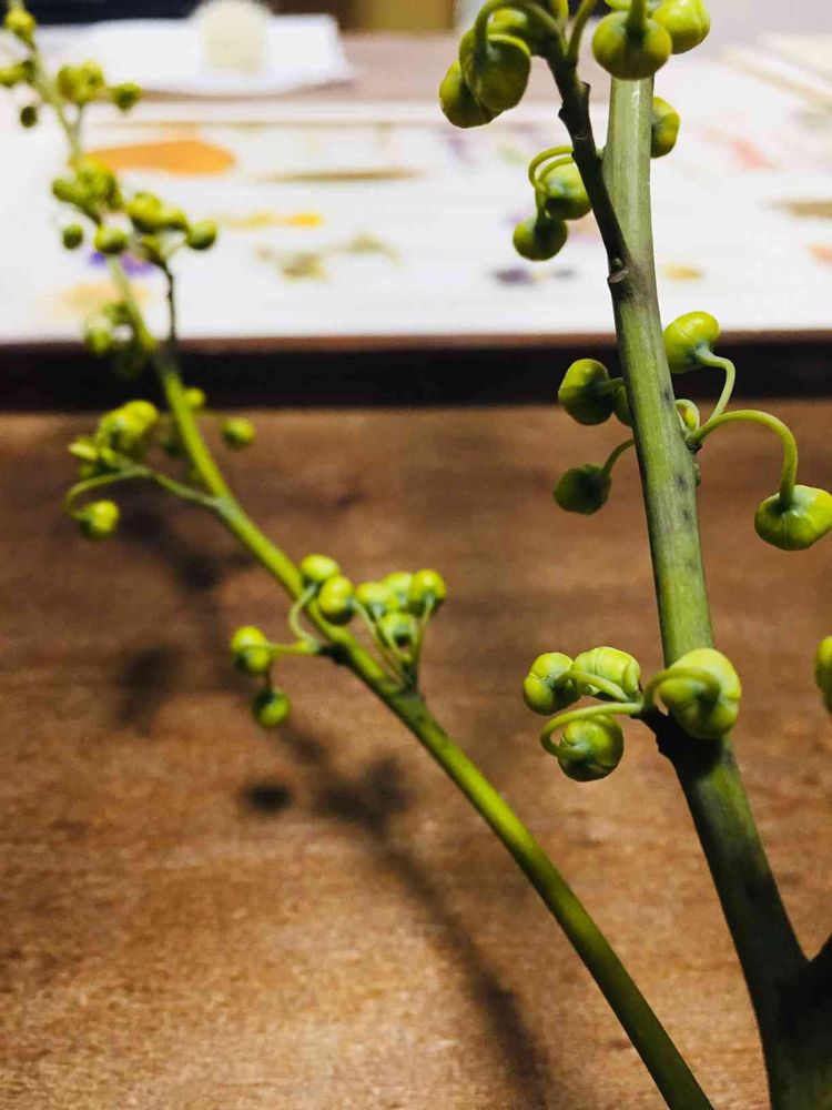 葉などは付いておらず、この緑の蕾のようなものだけ。一房に5個ほど蕾のようなものが固まって付いており、蕾は全て下に向かってアーチを描くように付いています。