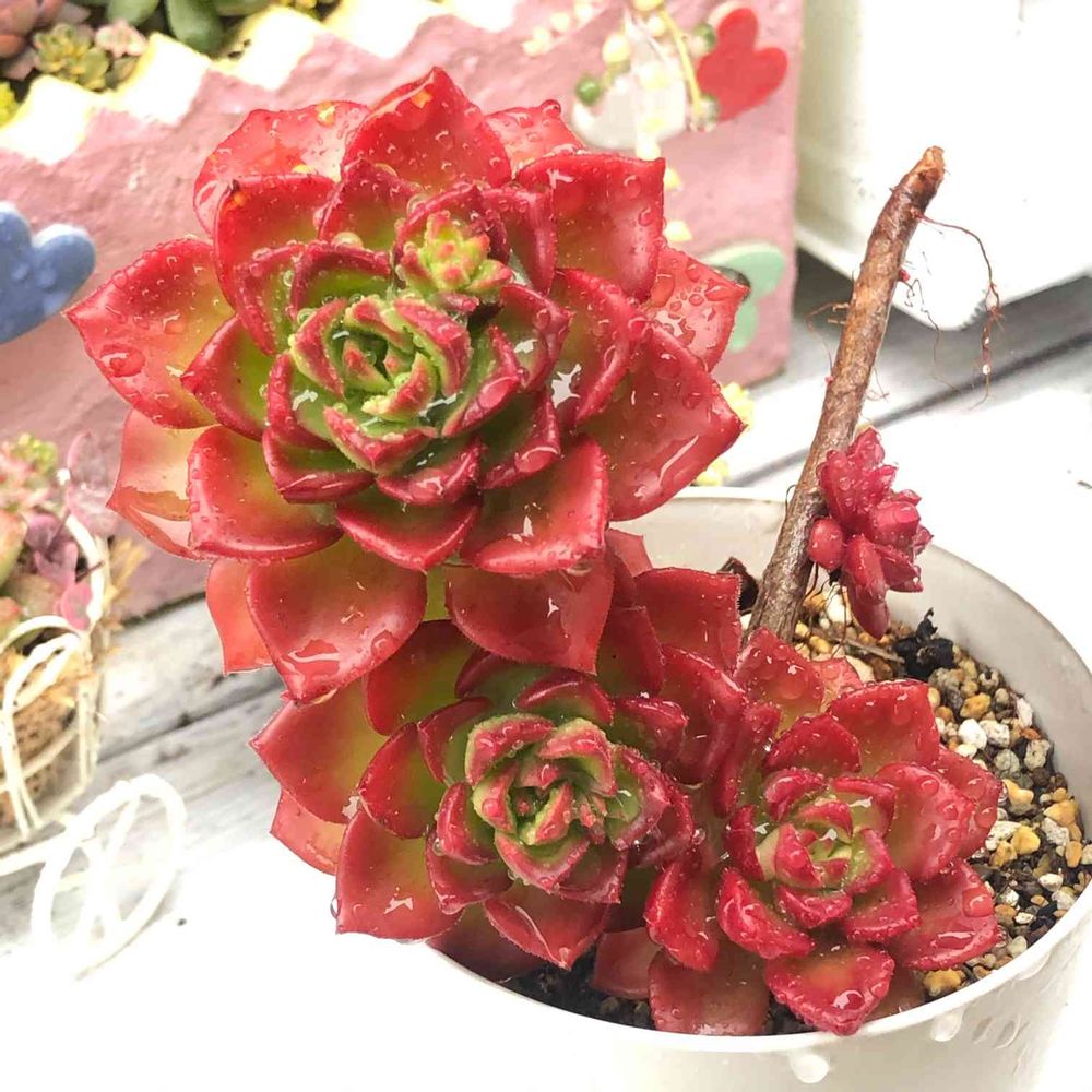 うちの子より真っ赤ですね😊茎から子株が生えてくれるのは嬉しくもあり、切り離すタイミングに迷いもあり‥笑