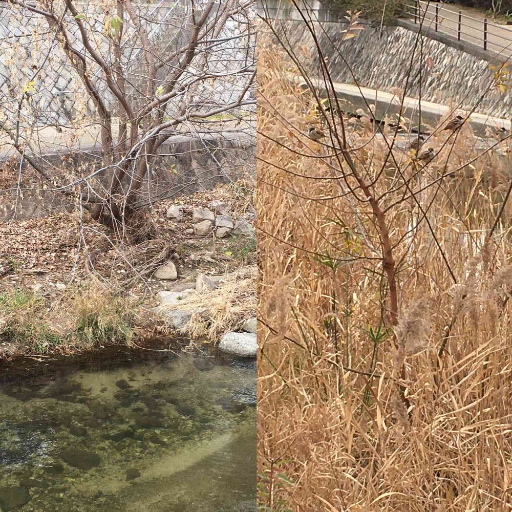 いつもの散歩の川の上流で伐採作業が進んでますが川の中にはまだ大きく育った木があります。