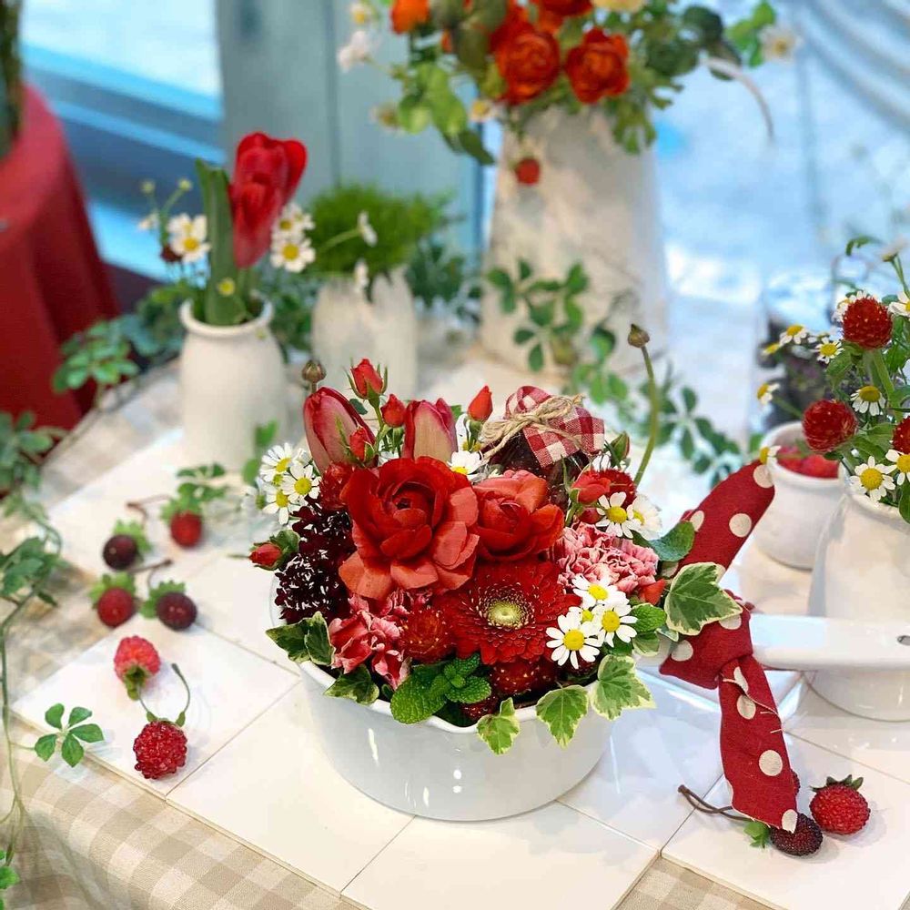 フラワーアレンジメントレッスン作品🌸今月はイチゴジャムをイメージしたアレンジメント。ホーローの片手鍋も可愛いな💕