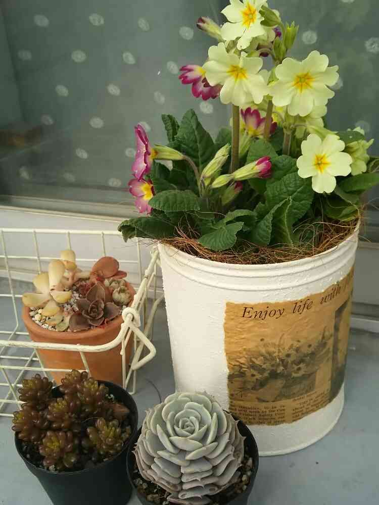 昨年 夏にうまれた孫👦が 初めてのんだミルクの空き缶に 色を塗って プリムラ✨を植えてみました🎵😊