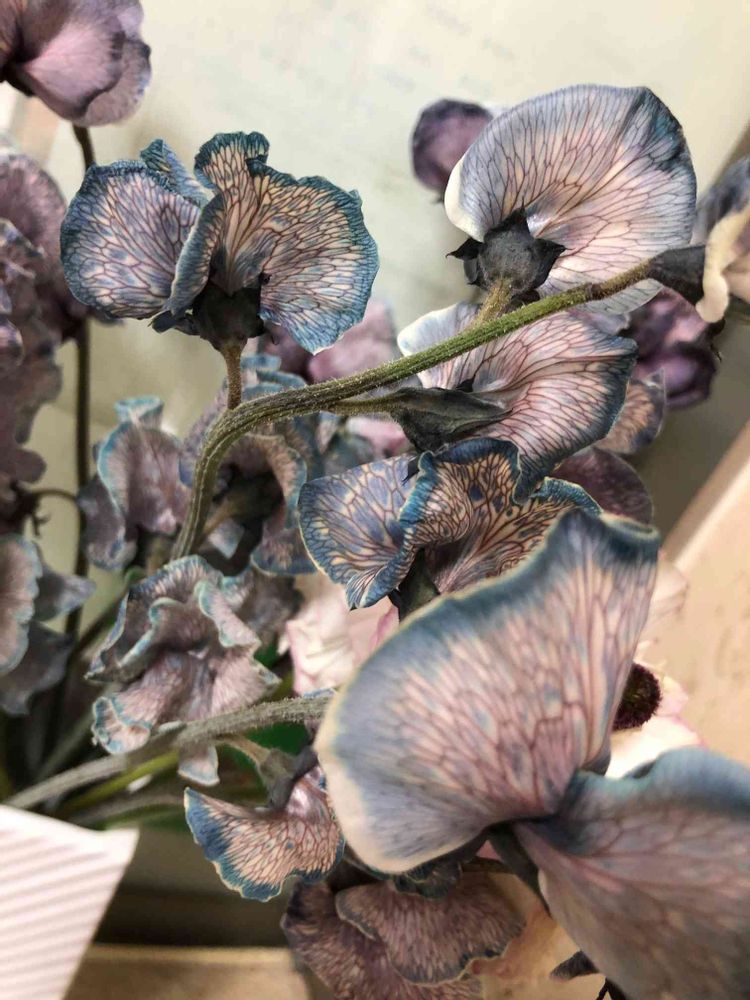 職場に飾ってあるスイトピー、今まで見たことのないような不気味な色です。まるで腐海に生えていた花みたいです。