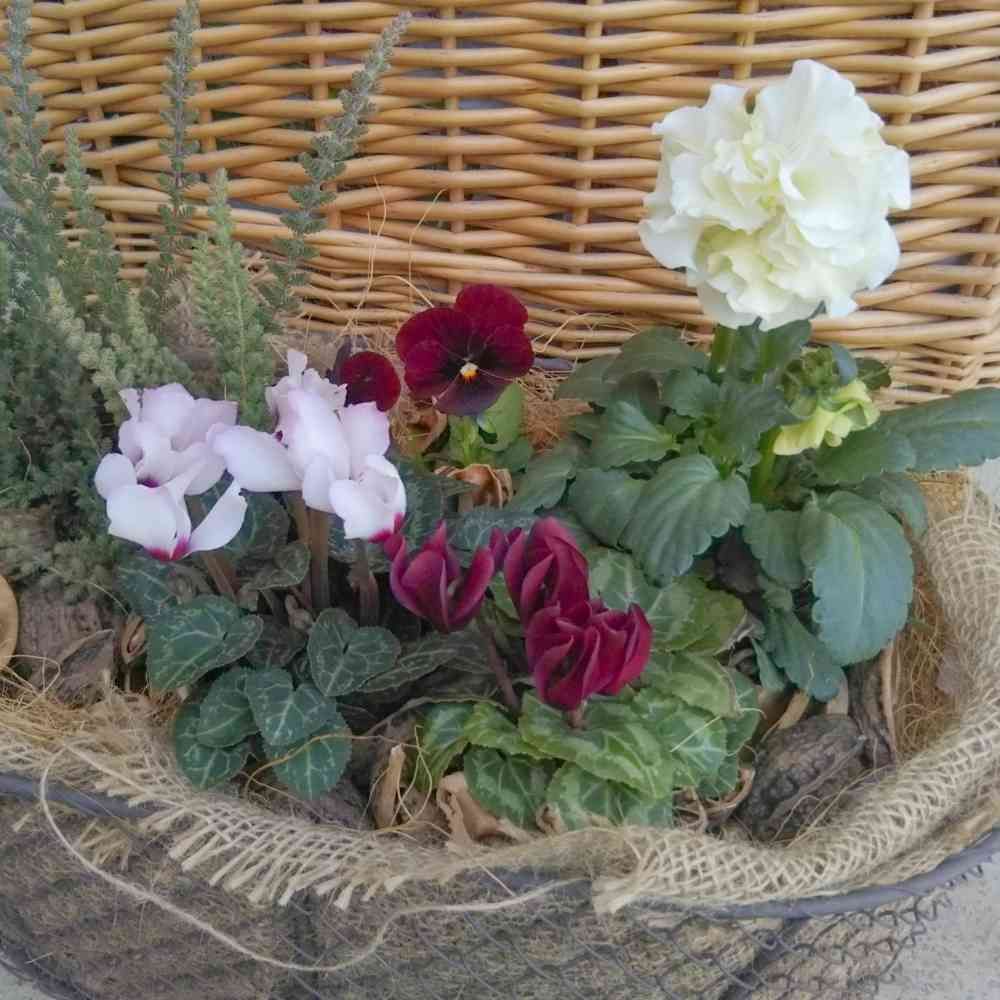 取っ手付きのワイヤーカゴ(初挑戦❣️)に冬の寄せ植え作りました🌿