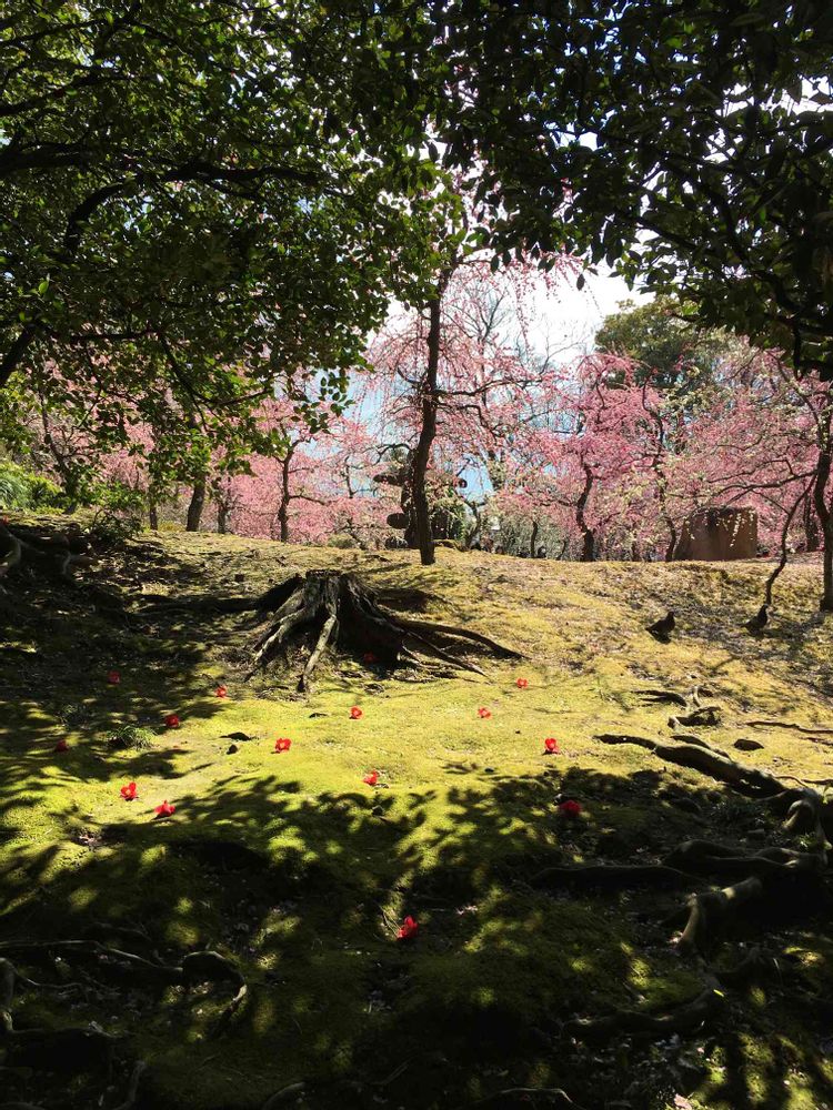 咲き誇る梅をバックに地に場所を変え咲き続ける椿。