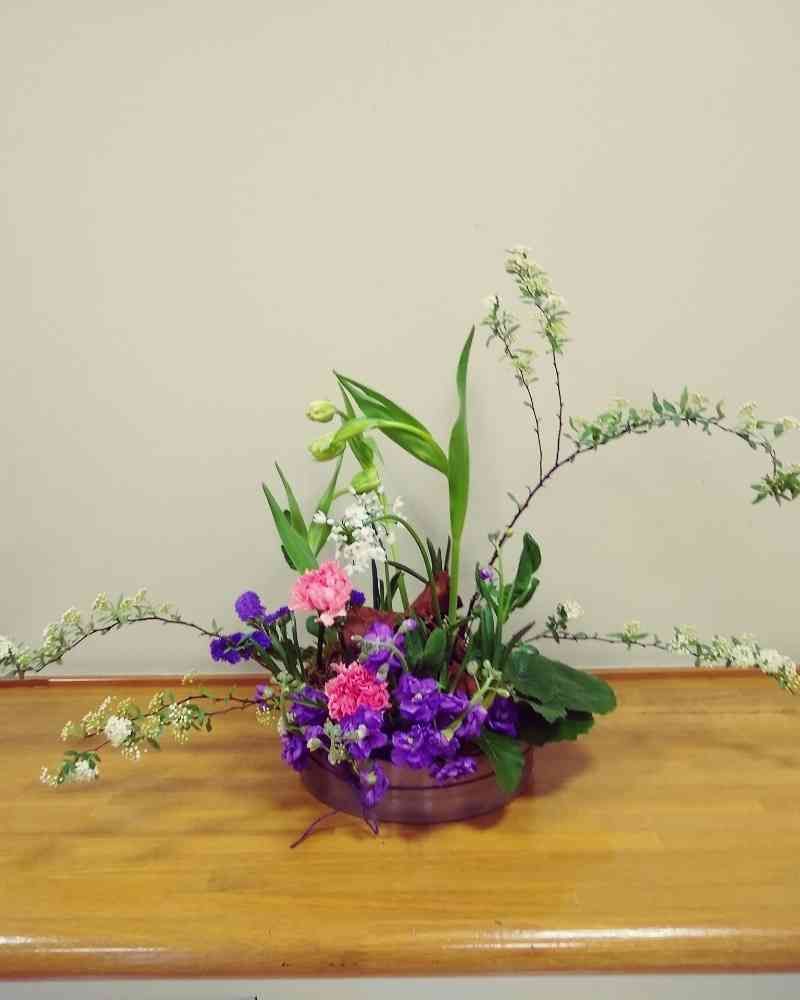 さん 今晩は。ガーデン風のアレンジメントをダッチといいます。オランダの先生の生け方だそうです。春のアレンジメントが素敵で私も楽しくできました。見て下さりありがとうございます。☺️💕
