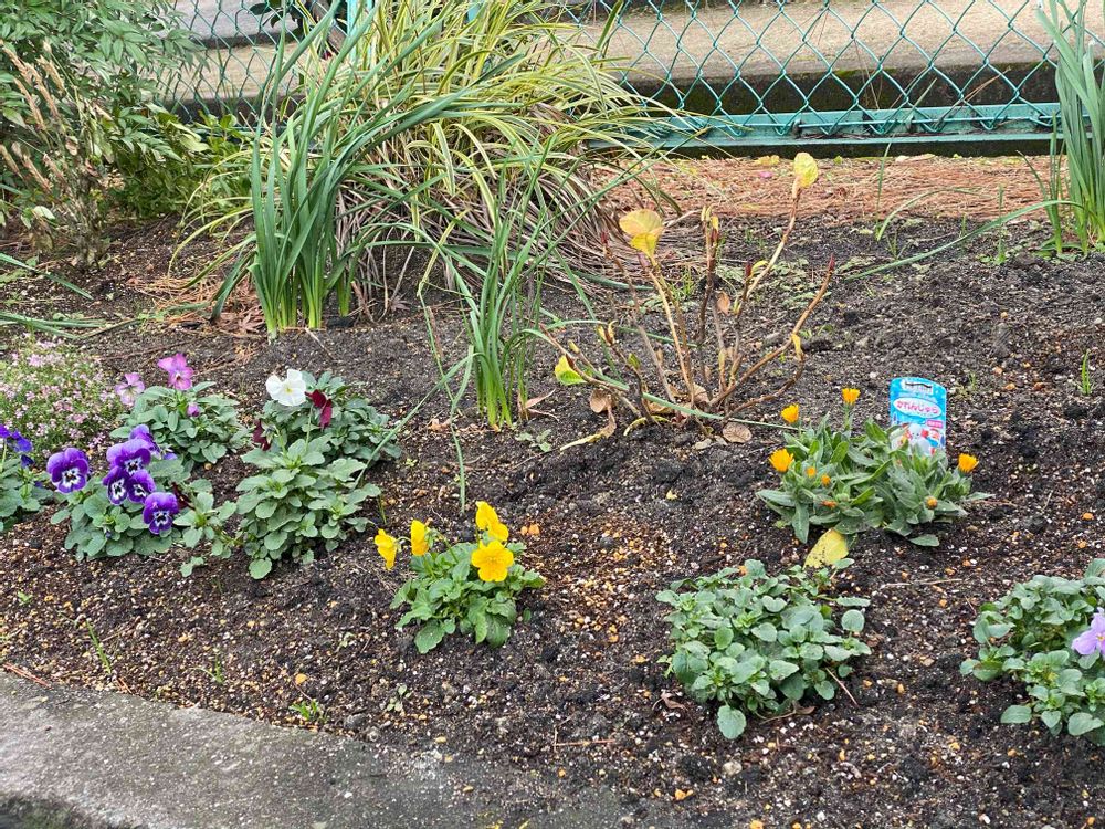 ヤブランや水仙は勝手に育ってます。アジサイやビオラたちを並べて植えてます。ビオラの花が少なめなのが気になるところですがオジさんが頑張ってるからいいのかな〜