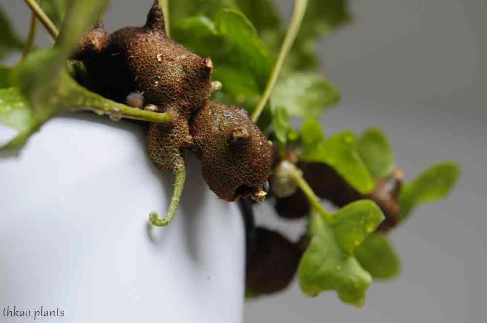 野生下ではこの穴から蟻に入ってもらい、蟻は住処を手に入れ、レカノプテリスは蟻に外敵から守ってもらうという共生をしています。