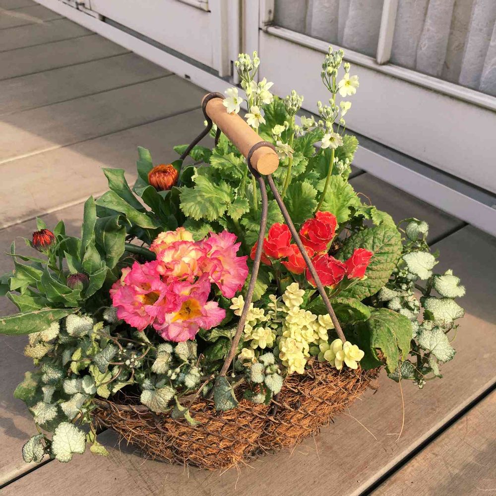 以前からカゴに寄せ植えをやってみたくて、これちょうど良いなと気づいて😆