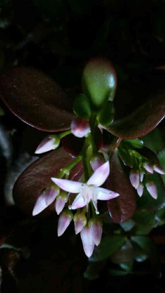 こんばんは。12/11に金のなる木の蕾を投稿しましたがようやくお花が咲き始めました。とてもとてもゆっくりです。これでは満開は3月でしょうか。長く楽しみます。