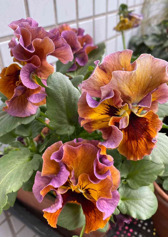 パンジーフリル。花大きいしフリフリも立派😄色はオレンジ🧡にパープル💜と微妙な色合い。そしてどんどん花芽が上がって来る💕💕なんか大当たりしたみたいで嬉しい❣️