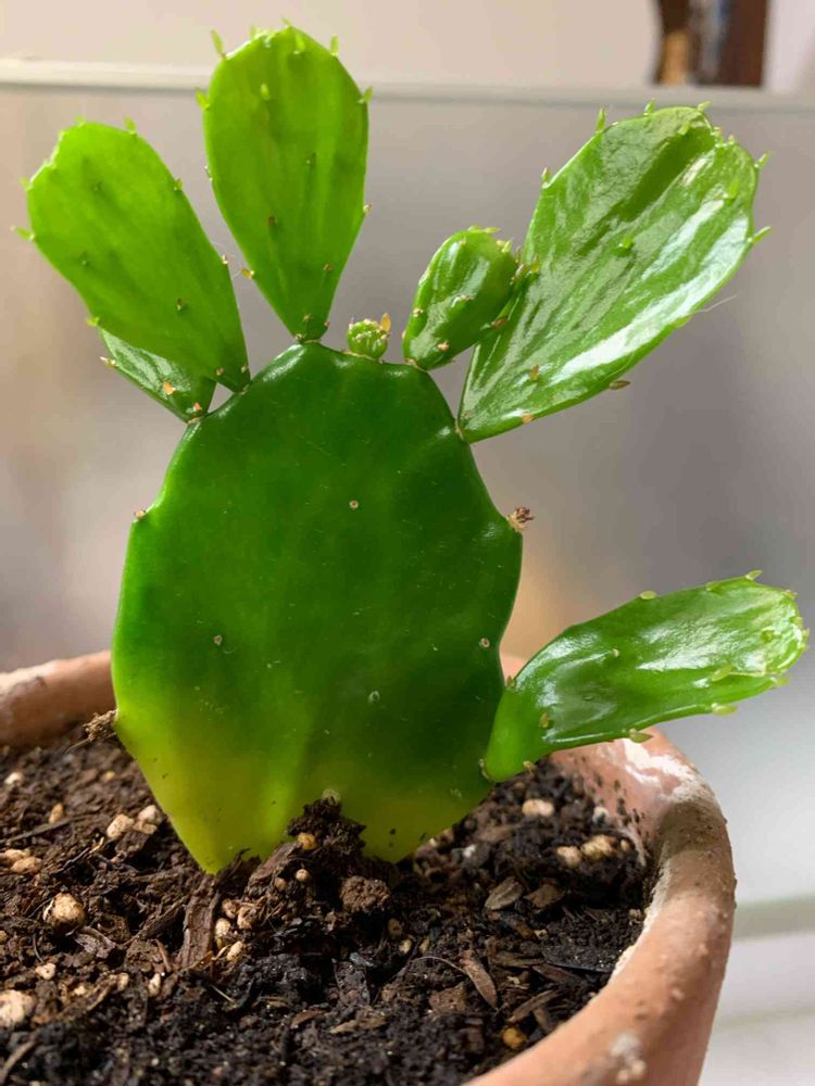 昨年の暮れにダイソーからお連れしたウチワサボテン。葉はとても薄いのですが生長が速く、仔吹した葉がだいぶ大きくなりました(^^)