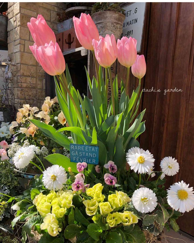 球根から植えているチューリップもたくさんありますが、待ちきれずに、蕾の状態の鉢花をお迎えして寄せ植えしました🌷