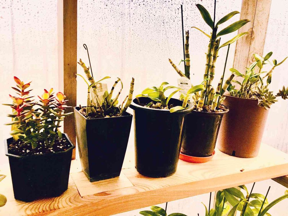 左から金のなる木、デントロビウム達と一番右側がデントロビウムの鉢に育った多肉ちゃんです❤