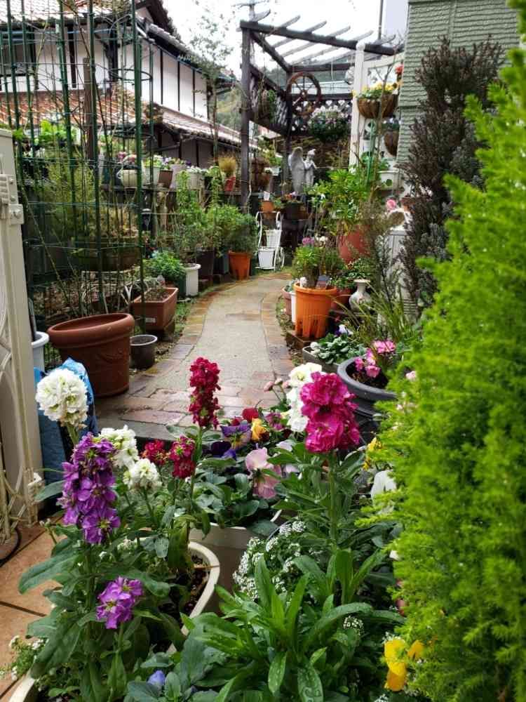 その先には、八重咲きストック、パンジー、プリムラなどが沢山咲いています。