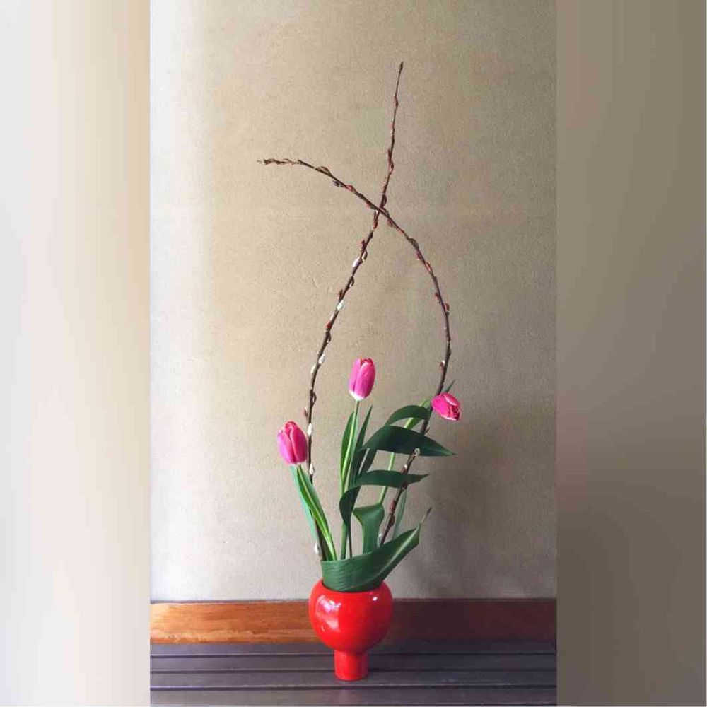 先日の生け花教室は春らしい花材でした🌷いただいた赤い花器に合わせてみました(╹◡╹)