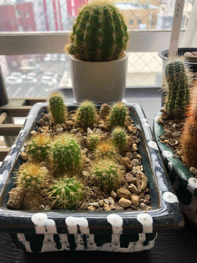 後ろの大きなサボテンの子供たちが手前の鉢に植えています。
