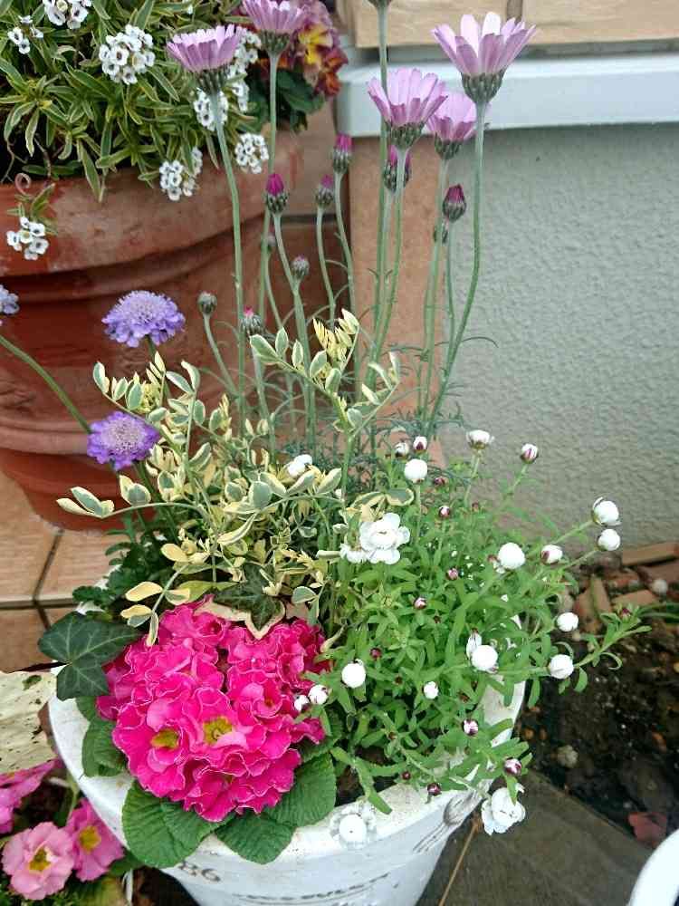 先日初春の寄せ植えを天気の良い日に作成しました😆。好きな苗ばかり入れて、玄関に1対おきました。😃🎶
