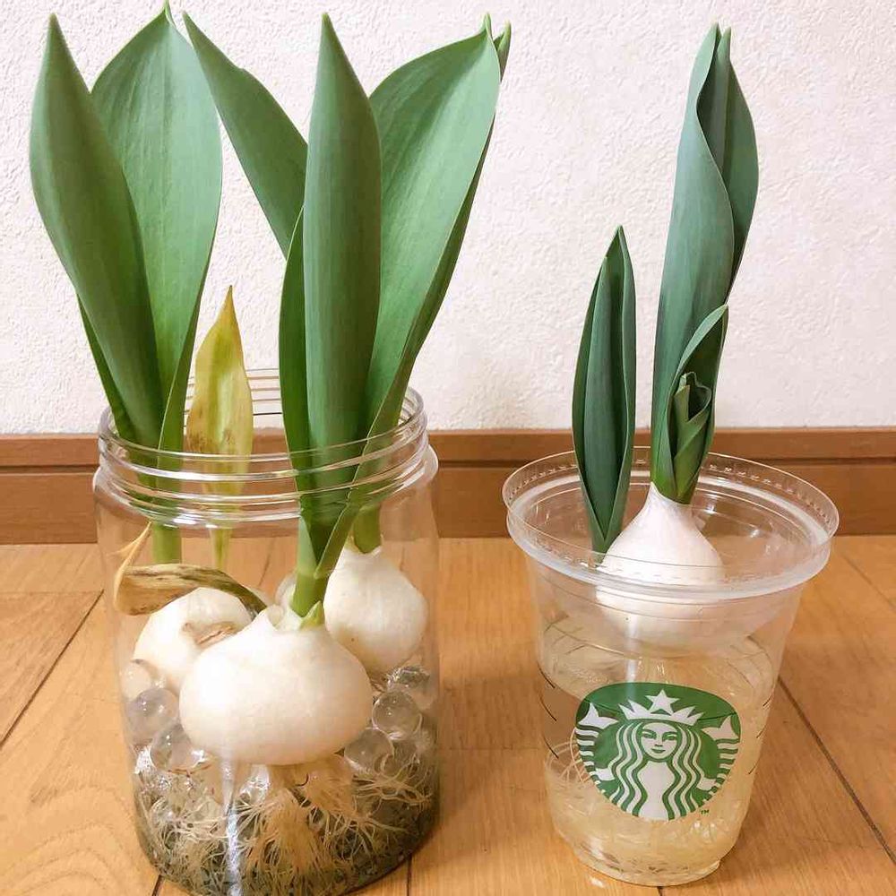 こちらもすっかり更新をサボっておりました🤣チューリップの水耕栽培!こんなに大きくなりました⭐️お水は週に1、2回交換してます😃