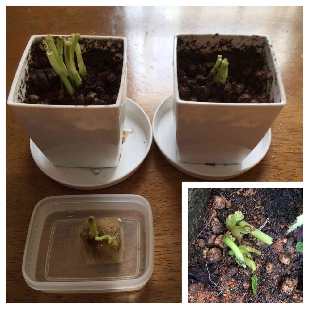 ミツバをスーパーで買い、残った根(スポンジ付き)4つ、しばらく水に浸けていましたが、1つは地植えに(写真右下)、1つは鉢植えにしてキッチン窓辺に、1つは鉢植えで外の軒下に、1つは水に浸けたままで育ててみることにしました。←小学生の自由研究かい!