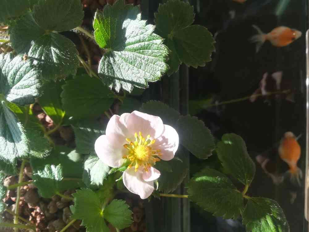 我が家の水槽、アクアポニックスのいちごの花が咲きました🎉